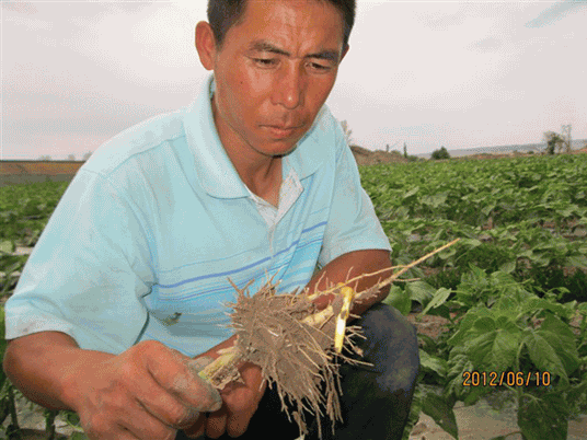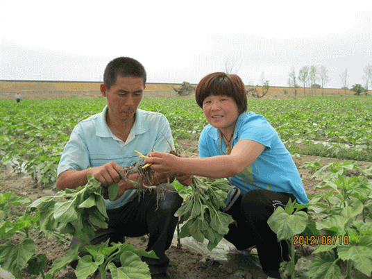 2012年,新疆阿勒泰地區(qū)科技特派員周琴視察“吉祥雨”復(fù)合微生物菌劑防治葵花列當(dāng)圖