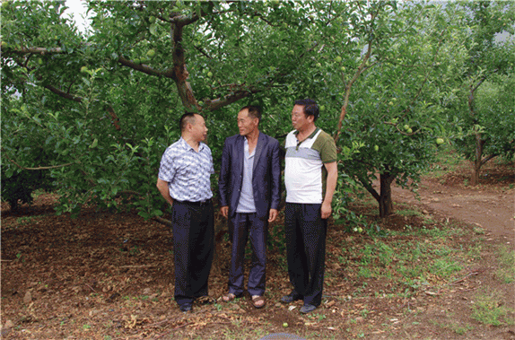 上圖為李總、晏站長、黃坐英社長與合作社果農(nóng)在蘋果園留影