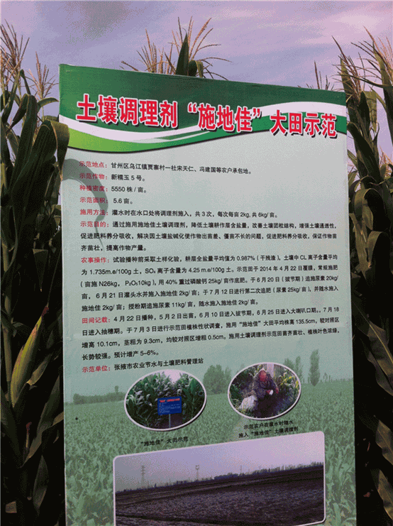 圖:“施地佳”土壤調理劑在甘肅張掖的大田示范牌