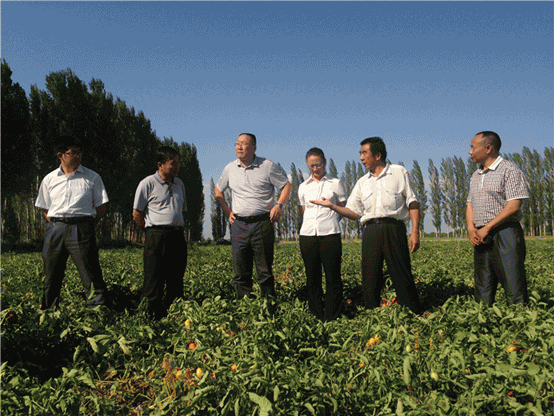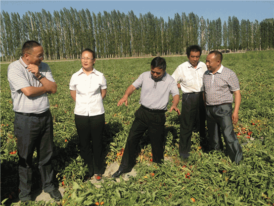 圖為:農(nóng)二師科技局馮局長、21團(tuán)韓團(tuán)長、趙科長與成都華宏生態(tài)農(nóng)業(yè)科技有限公司李智強(qiáng)總經(jīng)理來到加工番茄試驗(yàn)地查看番茄長勢。