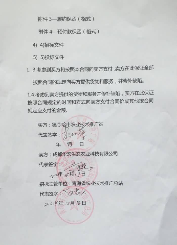 為完成國家土壤有機質(zhì)提升項目任務(wù),青海省德令哈市農(nóng)業(yè)技術(shù)推廣站主管并委托青海誠德招標(biāo)代理有限公司對青海省2014年耕地保護(hù)與質(zhì)量提升補助項目進(jìn)行公開招標(biāo),接受了成都華宏生態(tài)農(nóng)業(yè)科技有限公司以總價60萬元向青海省德令哈市農(nóng)業(yè)技術(shù)推廣站供應(yīng)經(jīng)過多年試驗示范的可信度極高的鹽堿土壤調(diào)理劑。