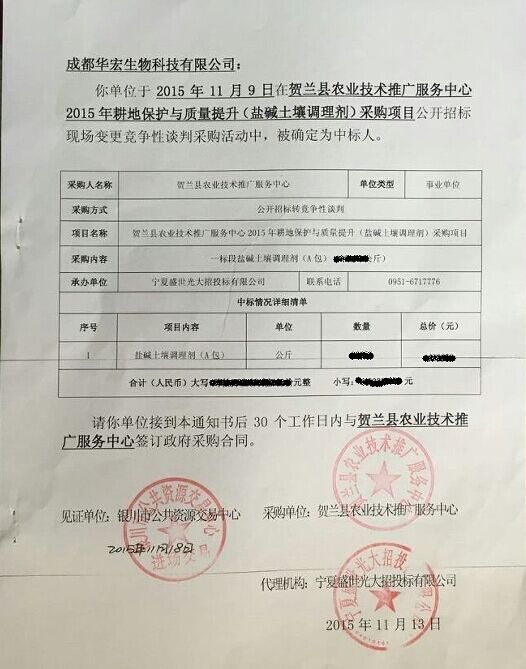 不久前,國內(nèi)土壤調(diào)理劑產(chǎn)品研發(fā)生產(chǎn)先導(dǎo)型企業(yè)——成都華宏生態(tài)農(nóng)業(yè)科技有限公司,收到了一份特別的通知書,“賀蘭縣政府采購”幾個(gè)大字分外顯眼,無不讓人感覺這份通知書的分量十足。筆者了解到,這是該企業(yè)參與賀蘭縣農(nóng)業(yè)技術(shù)推廣服務(wù)中心“2015年鹽堿土壤調(diào)理劑采購項(xiàng)目”投標(biāo)的中標(biāo)通知書,該通知書的取得也意味著成都華宏在同類投標(biāo)中連續(xù)四年中標(biāo),如此傲人的成績?cè)跇I(yè)內(nèi)還不多見。
