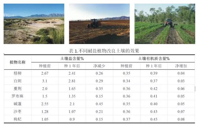 種植一些耐鹽堿植物,在利用植物降低水分蒸發(fā)的同時通過植物回收鹽堿地土壤中的鹽分。種植耐鹽堿地植物后重鹽土含鹽量會有所降低,有試驗結(jié)果表明每公頃的鹽地堿蓬和堿爪爪每年可以從鹽堿土中分別吸收2294.6kg和2792.7kg的鹽分(NaCl);灌木樹種白刺,基本上可以降低土壤表層鹽分50%~70%。